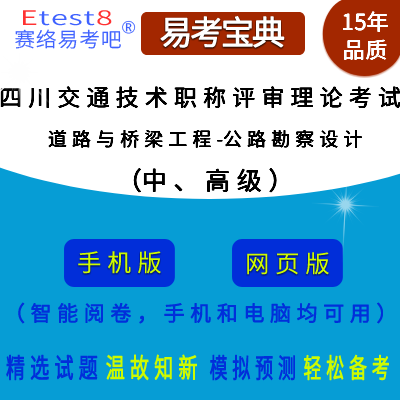 2026年四川省交通工程职称评审理论测试(道路与桥梁工程-公路勘察设计)在线题库(中、高级)是易考吧备考复习在线题库之一,是专门为参加“工程技术职称评审理论考试”的朋友量身定做的自我测试系统,是个人、培训学校进行考试前训练、备考冲刺的提分技巧考试平台,题型丰富,图文并茂,内容全面,题库设计符合考试新大纲,海量试题。题库包括了富有价值的模拟考场,有计时打分等功能,就像亲身体会考试一样。题库中的题型和题量详细介绍如下: