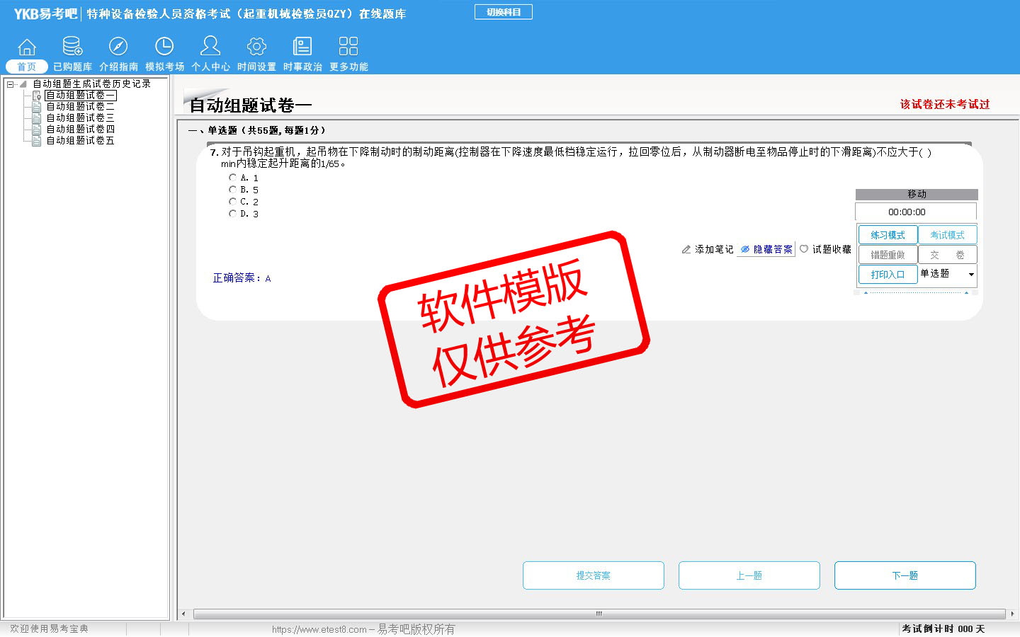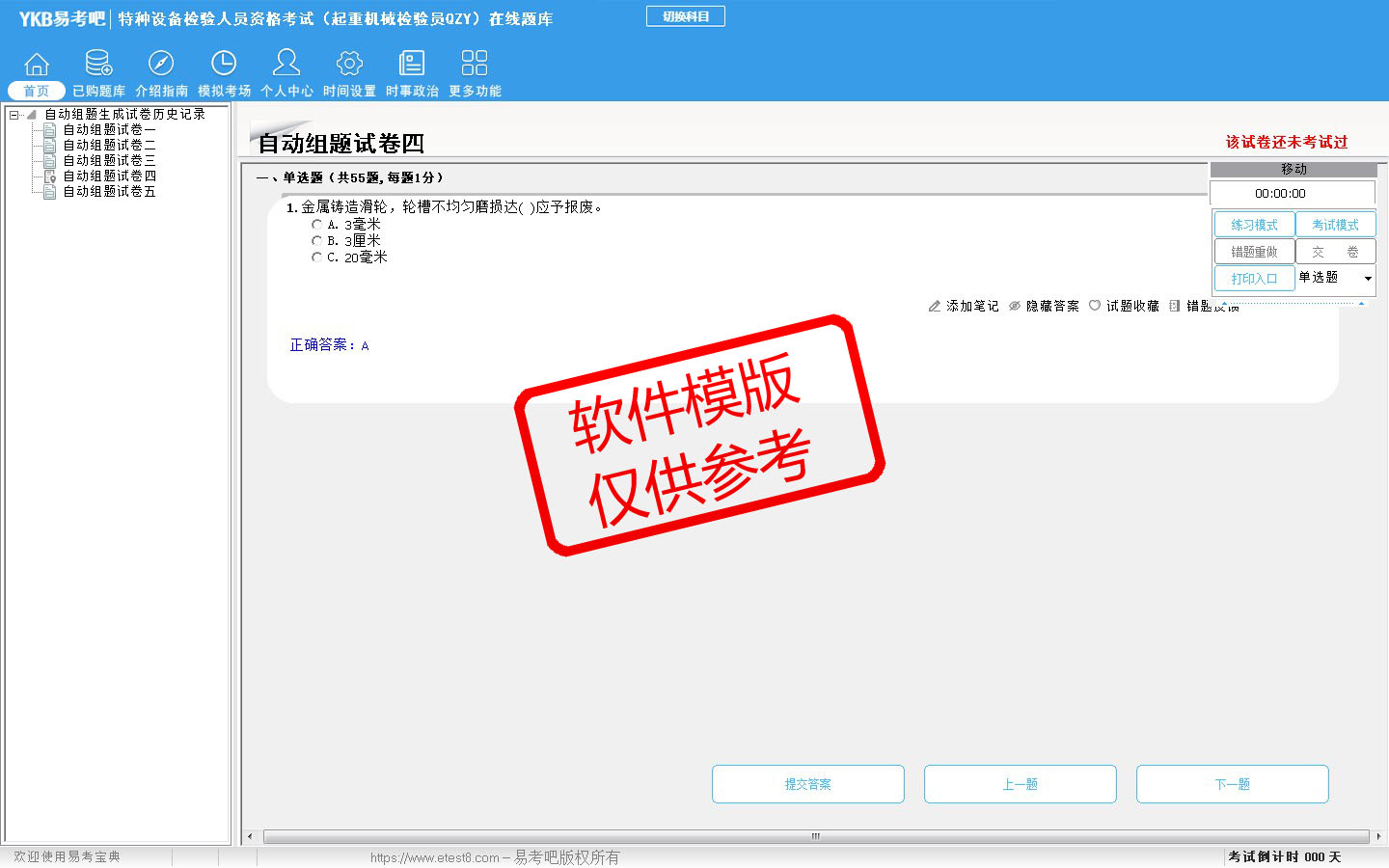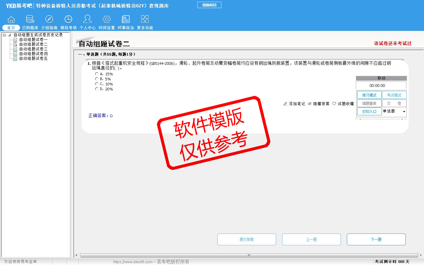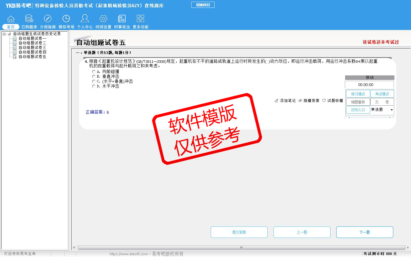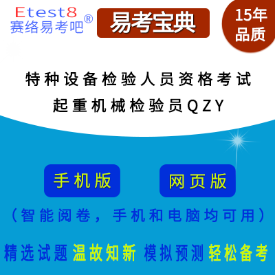 2026年特种设备检验人员资格考试(起重机械检验员QZY)在线题库是易考吧在线题库系统之一,是专门为参加特种设备检验人员考试的朋友量身定做的自我测试系统,是个人、培训学校进行考试前训练、备考冲刺的提分技巧考试平台,题型丰富,图文并茂,内容全面,题库设计符合考试新大纲,海量试题。软件包括了富有价值的模拟考场,有计时打分等功能,就像亲身体会考试一样。软件中的题型和题量详细介绍如下:
