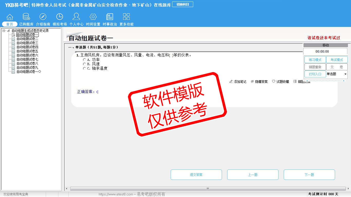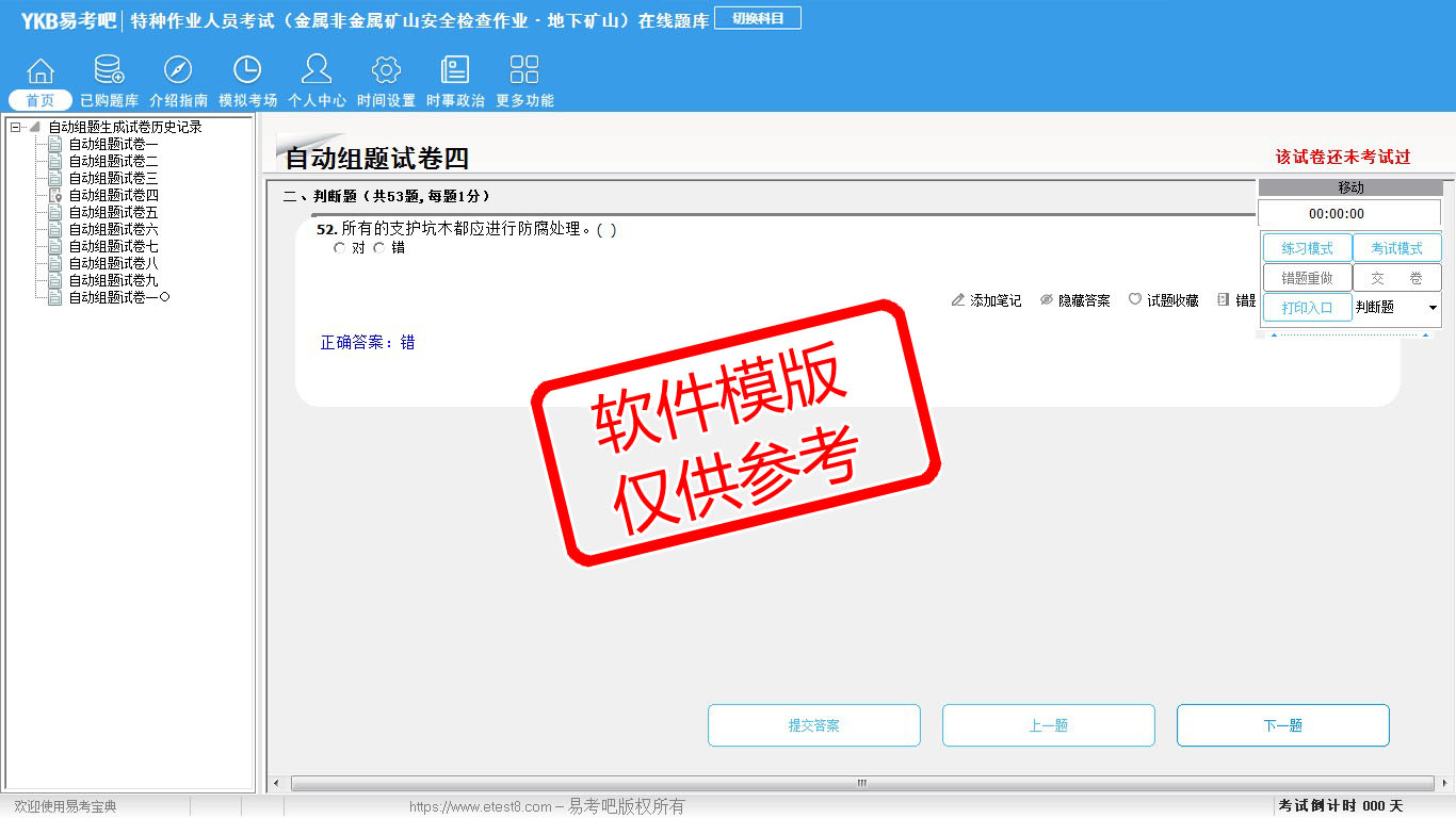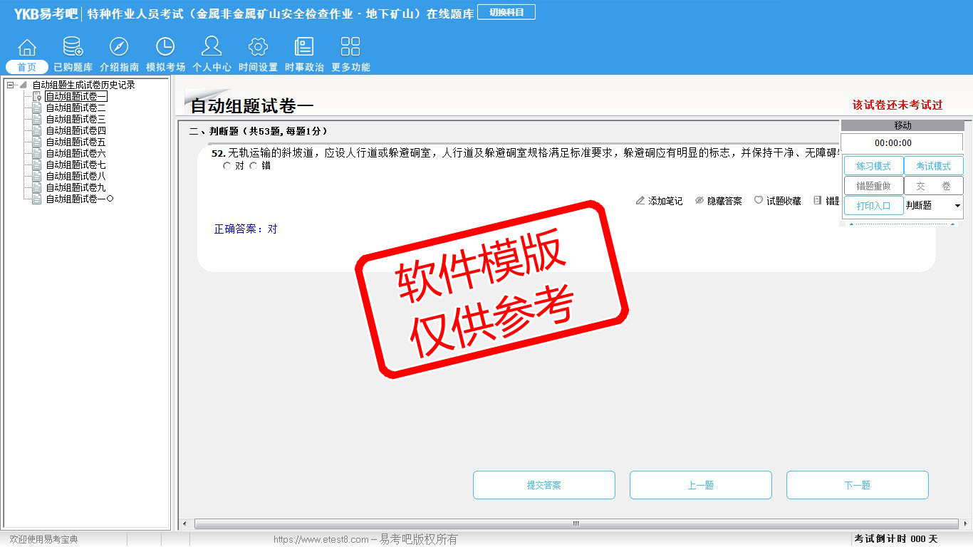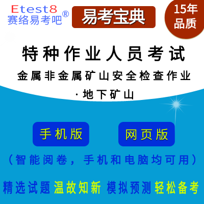 2026年特种作业人员考试(金属非金属矿山安全检查作业·地下矿山)在线题库是易考吧备考复习在线题库之一,是专门为参加“特种作业人员考试”的朋友量身定做的自我测试系统,是个人、培训学校考前进行提分训练、备考冲刺的训练平台,该题库题型丰富,图文并茂,内容全面;题库设计符合考试新大纲,题库包括了富有价值的模拟考场,有计时打分等功能,就像亲身体会考试一样。题库中的题型和题量详细介绍如下: