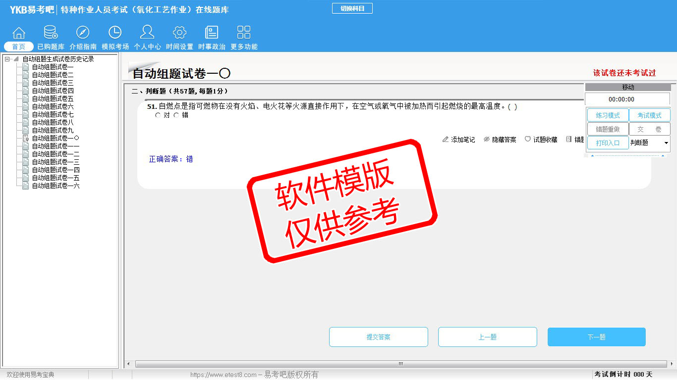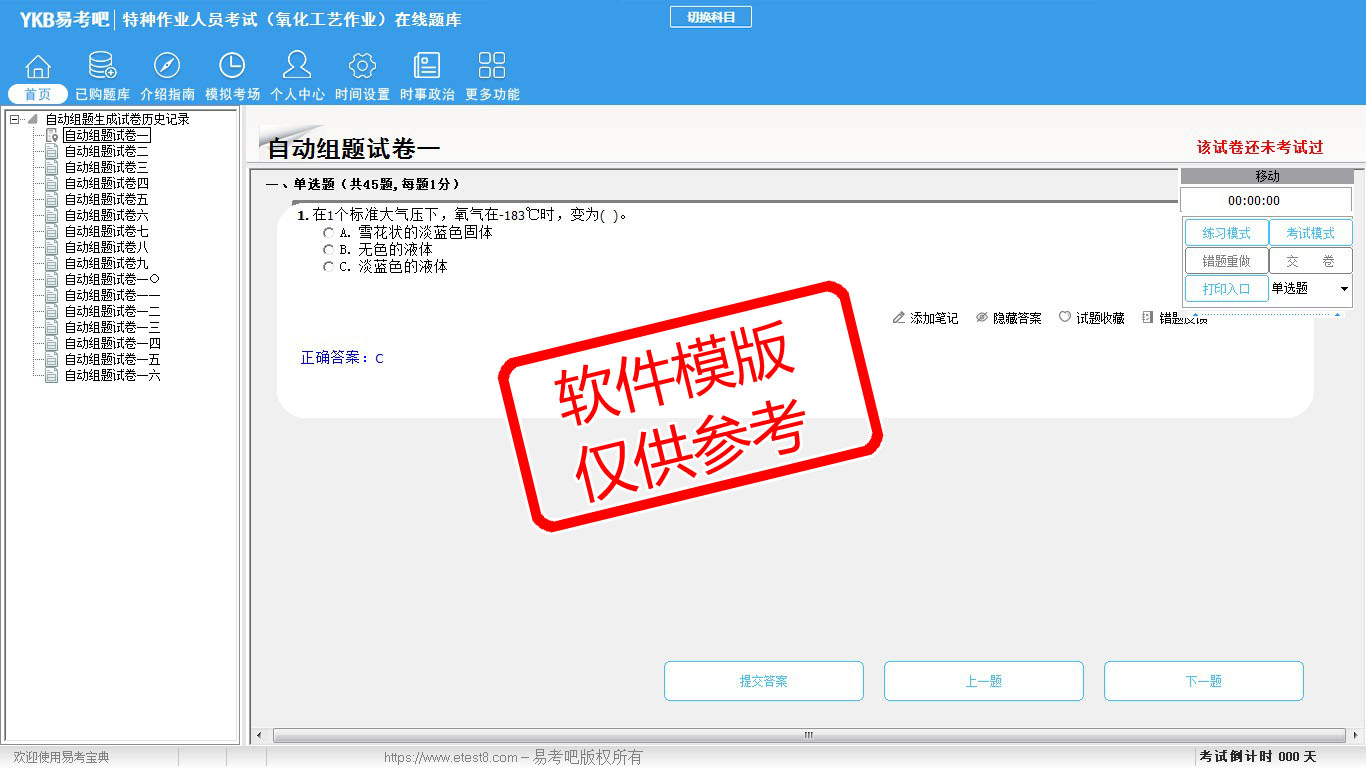 2026年特种作业人员考试(氧化工艺作业)在线题库是易考吧备考复习在线题库之一,是专门为参加“特种作业人员考试”的朋友量身定做的自我测试系统,是个人、培训学校考前进行提分训练、备考冲刺的训练平台,该题库题型丰富,图文并茂,内容全面;题库设计符合考试新大纲,题库包括了富有价值的模拟考场,有计时打分等功能,就像亲身体会考试一样。题库中的题型和题量详细介绍如下: