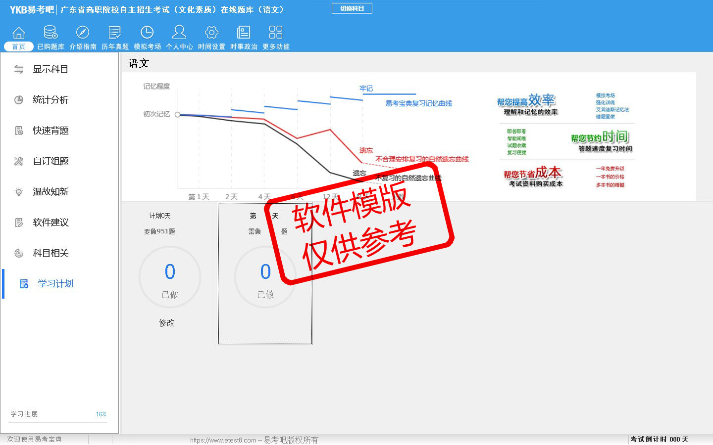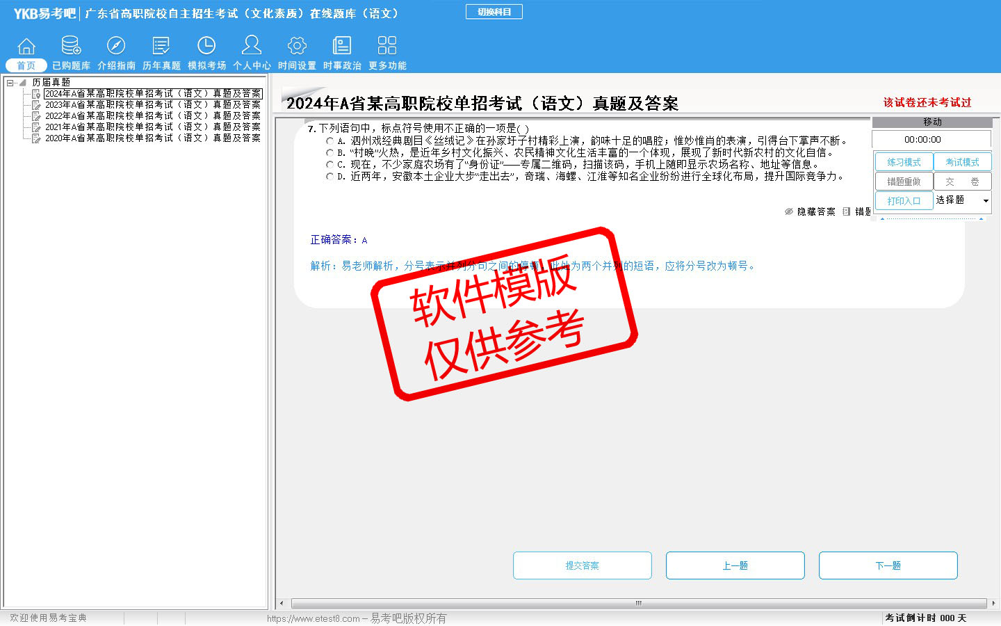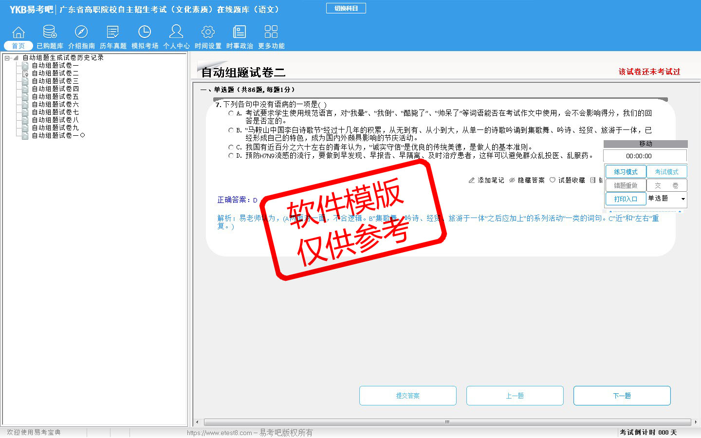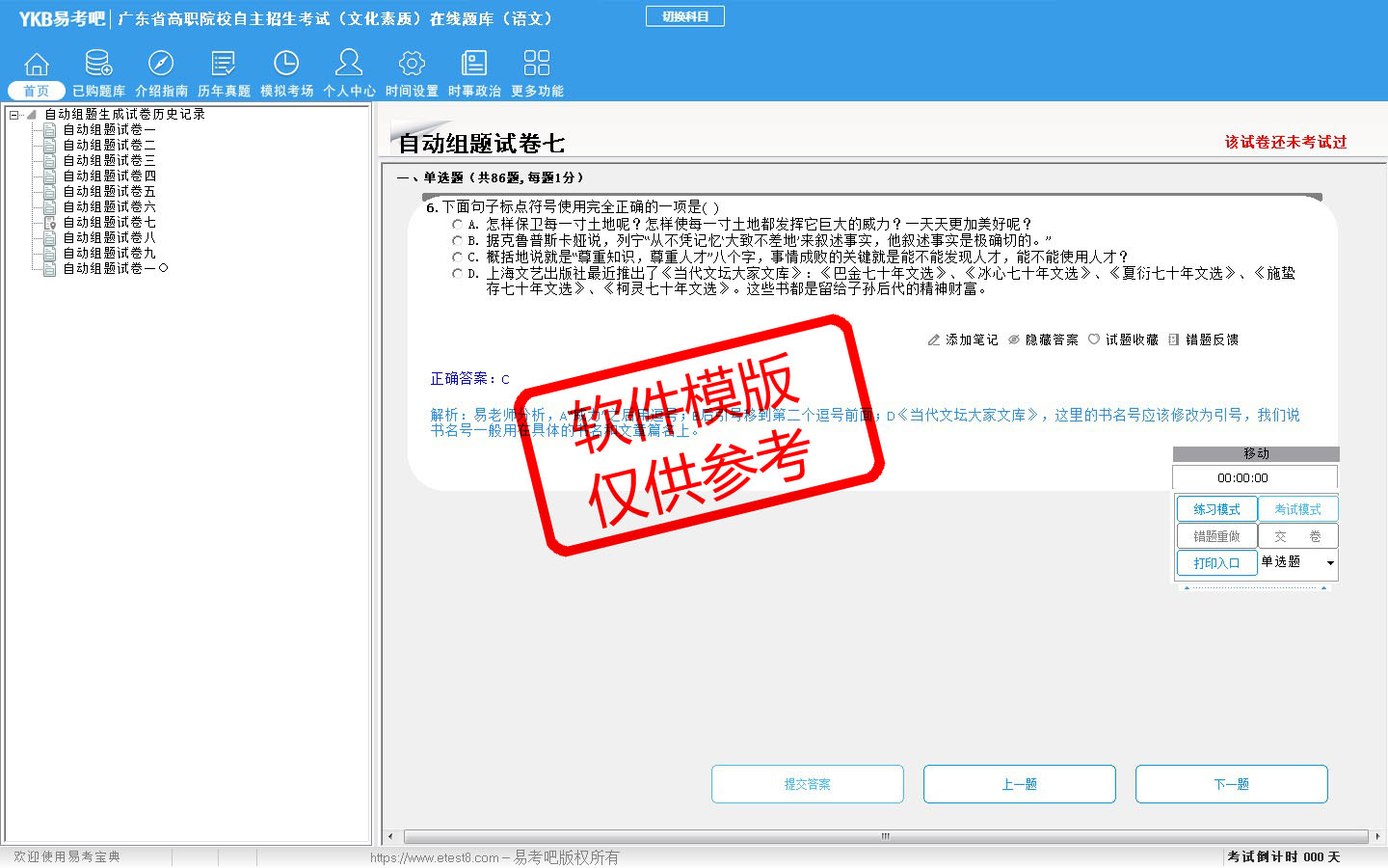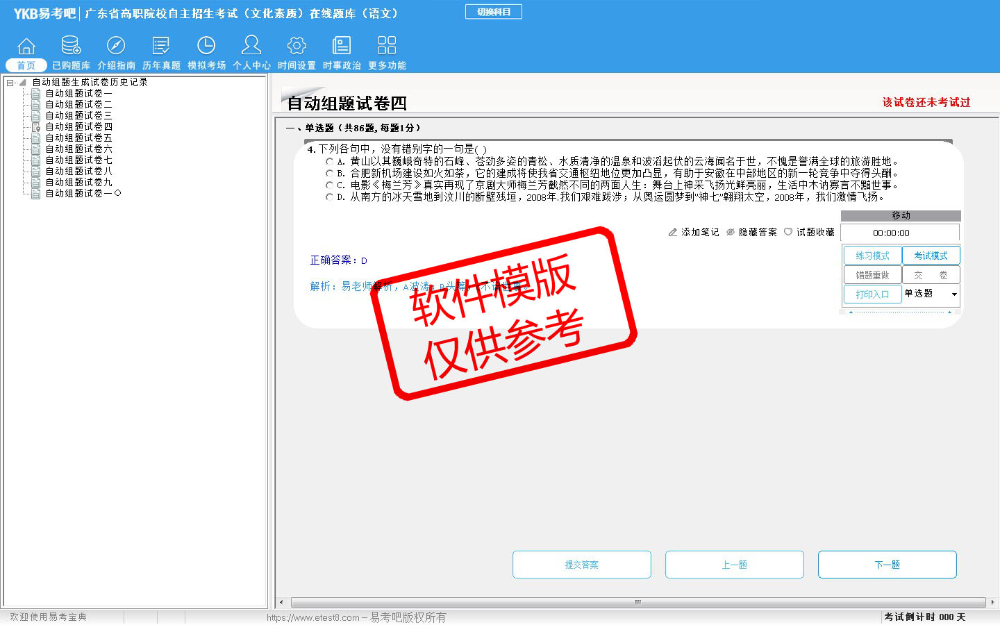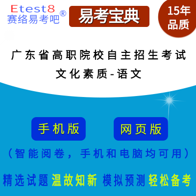 2026年广东省高职院校自主招生考试(文化素质)在线题库(语文)是易考吧在线题库考试系列软件之一,是专门为参加高职院校单独招生/分类考试的朋友量身定做的自我测试系统,是个人、培训学校进行考试前训练、备考冲刺的提分技巧考试平台,题型丰富,图文并茂,内容全面,题库设计符合考试新大纲,海量试题。软件包括了富有价值的模拟考场,有计时打分等功能,就像亲身体会考试一样。软件中的题型和题量详细介绍如下: