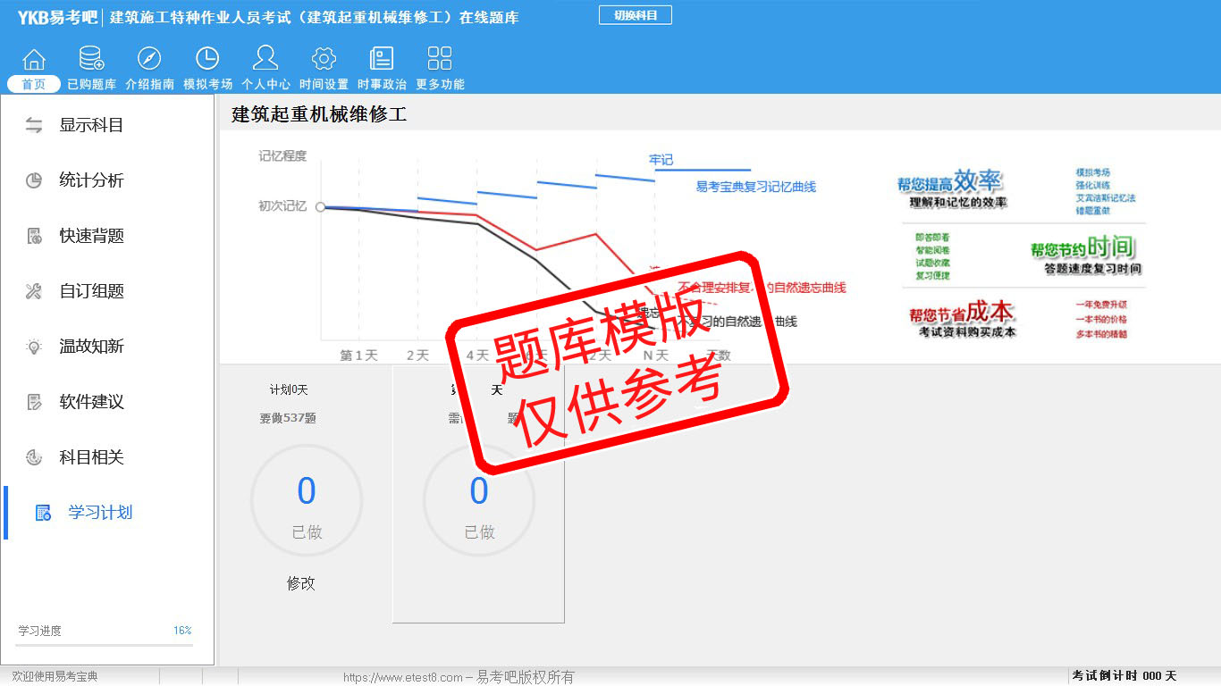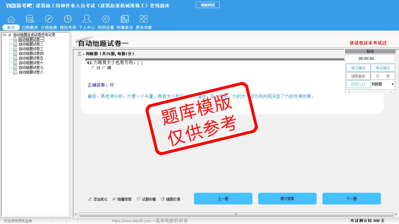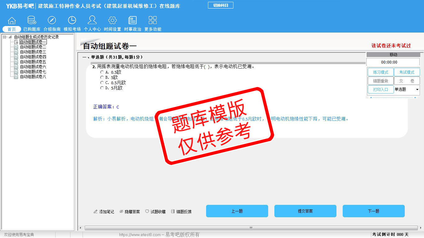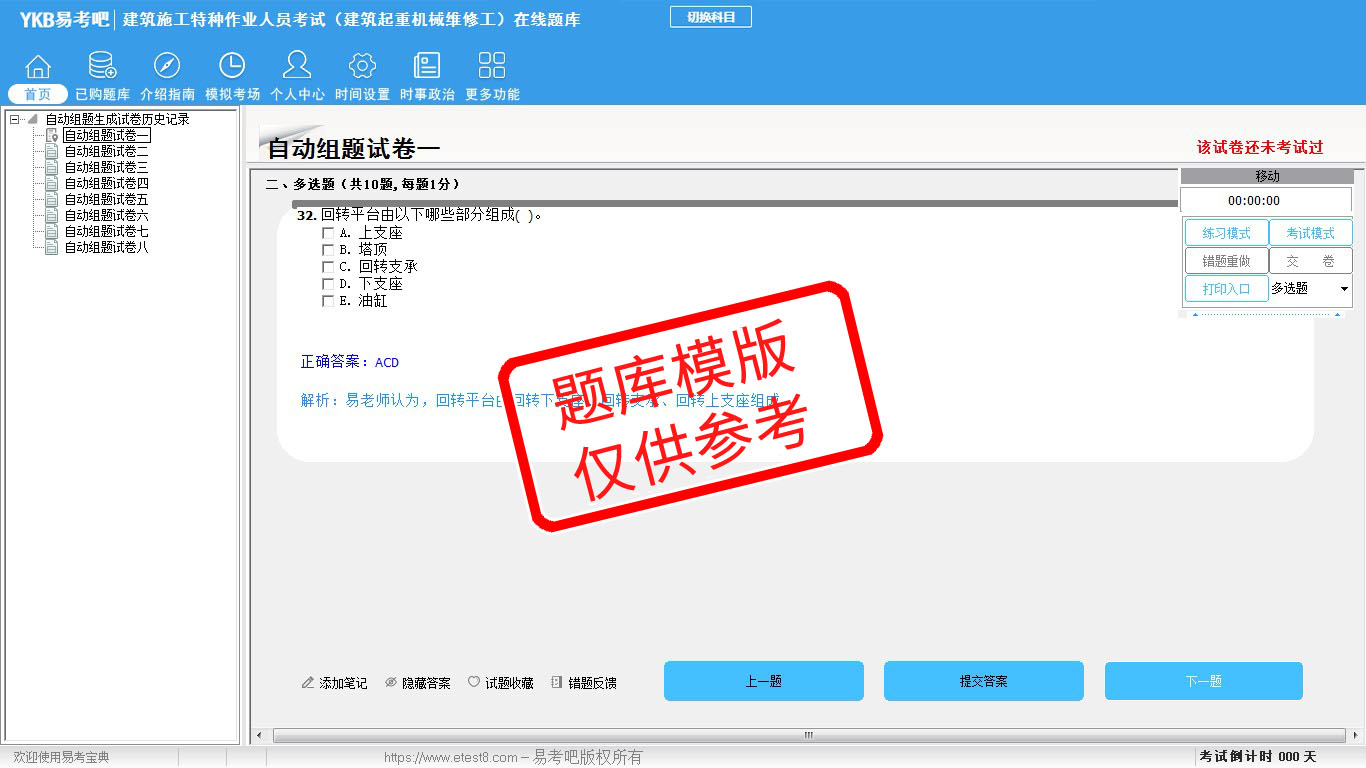 2026年建筑施工特种作业人员考试(建筑起重机械维修工)在线题库是易考吧备考复习在线题库之一,是专门为参加“建筑施工特种作业人员考试”的朋友量身定做的自我测试系统,是个人、培训学校考前进行提分训练、备考冲刺的训练平台,该题库题型丰富,图文并茂,内容全面;题库设计符合考试新大纲,题库包括了富有价值的模拟考场,有计时打分等功能,就像亲身体会考试一样。题库中的题型和题量详细介绍如下: