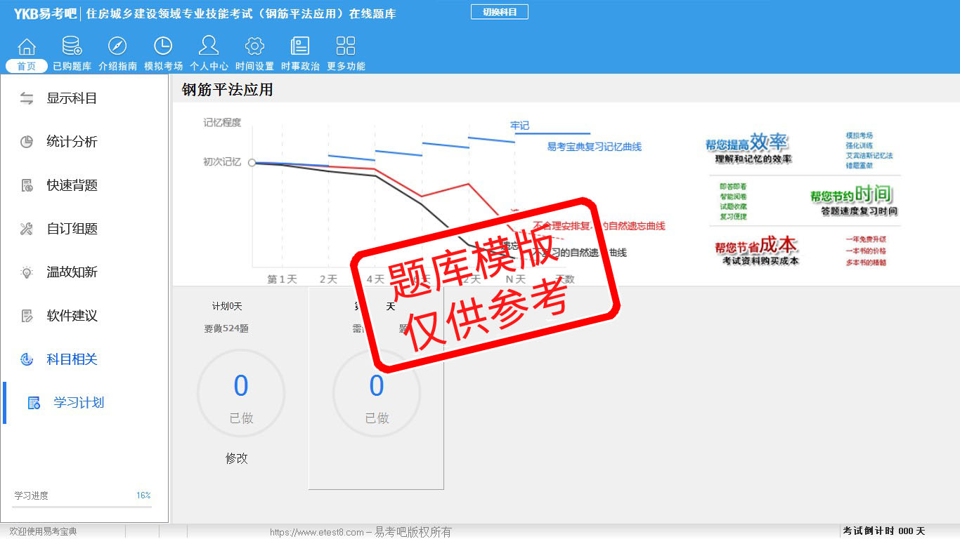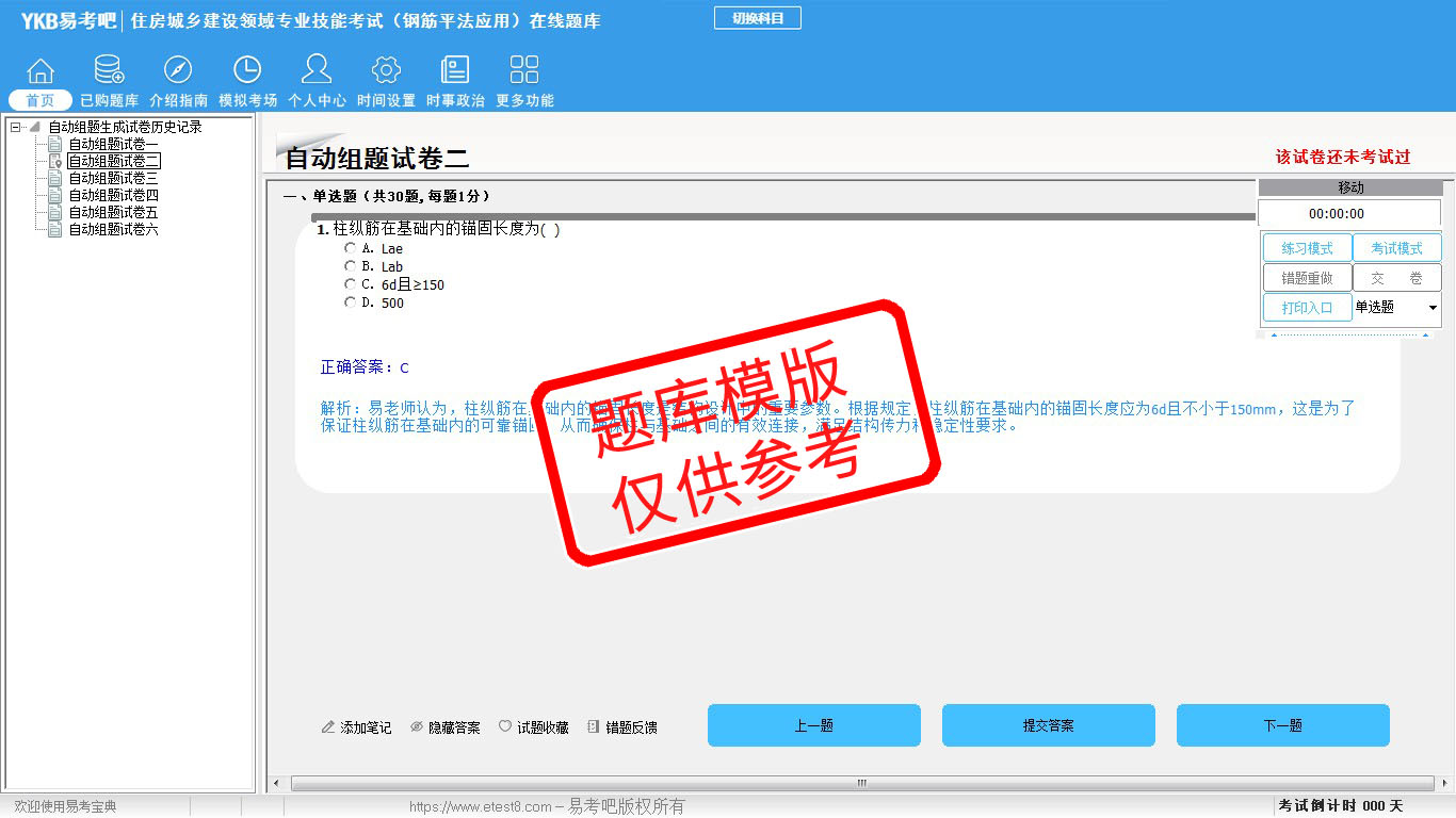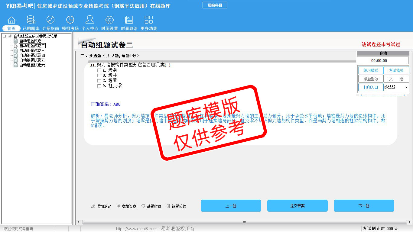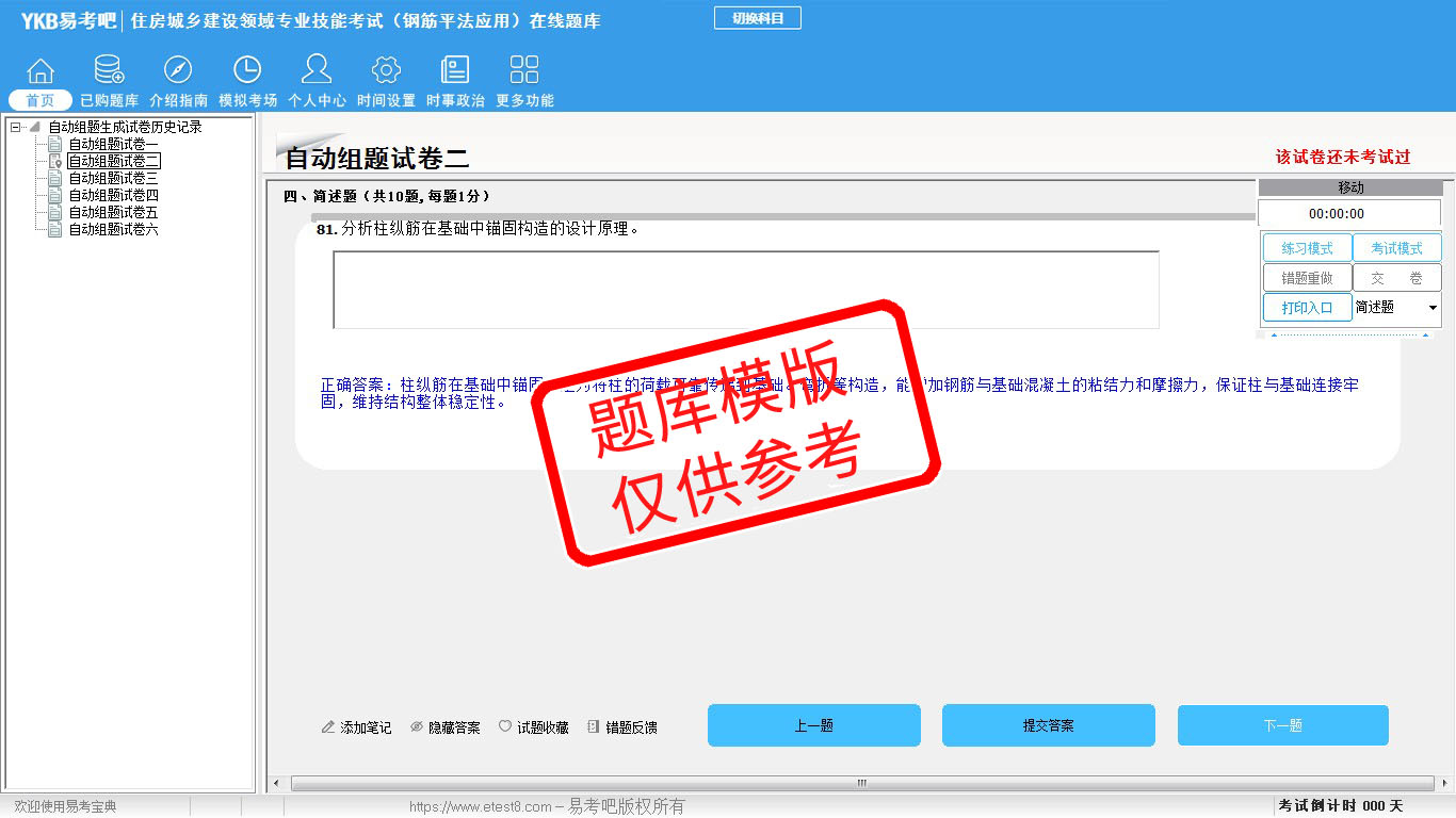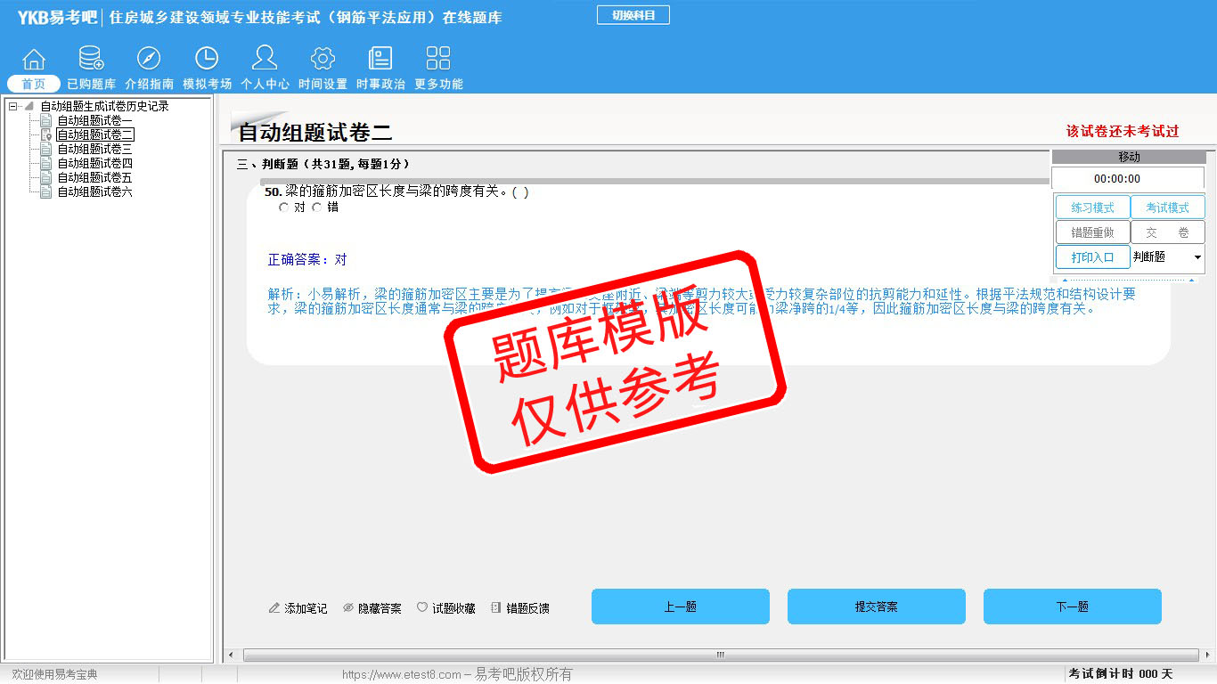 2026年住房城乡建设领域专业技能考试(钢筋平法应用)在线题库是易考吧备考复习在线题库之一,是专门为参加“住房城乡建设领域专业技能考试”的朋友量身定做的自我测试系统,是个人、培训学校考前进行提分训练、备考冲刺的训练平台,该题库题型丰富,图文并茂,内容全面;题库设计符合考试新大纲,题库包括了富有价值的模拟考场,有计时打分等功能,就像亲身体会考试一样。题库中的题型和题量详细介绍如下: