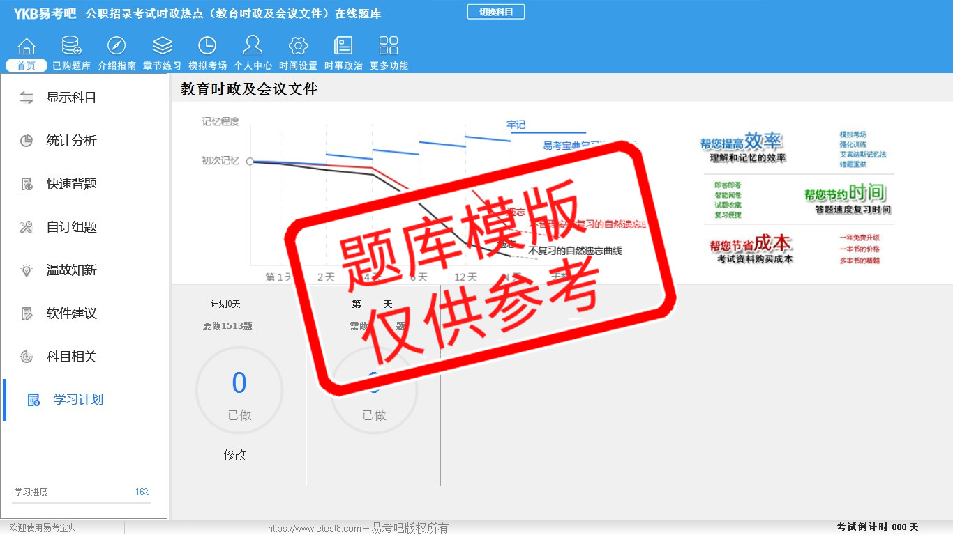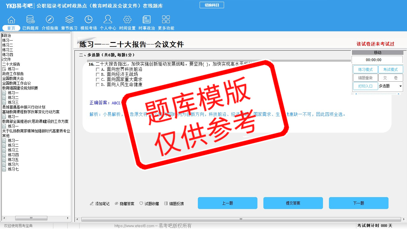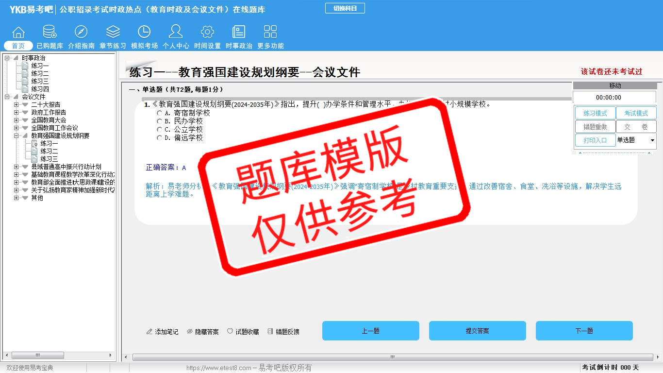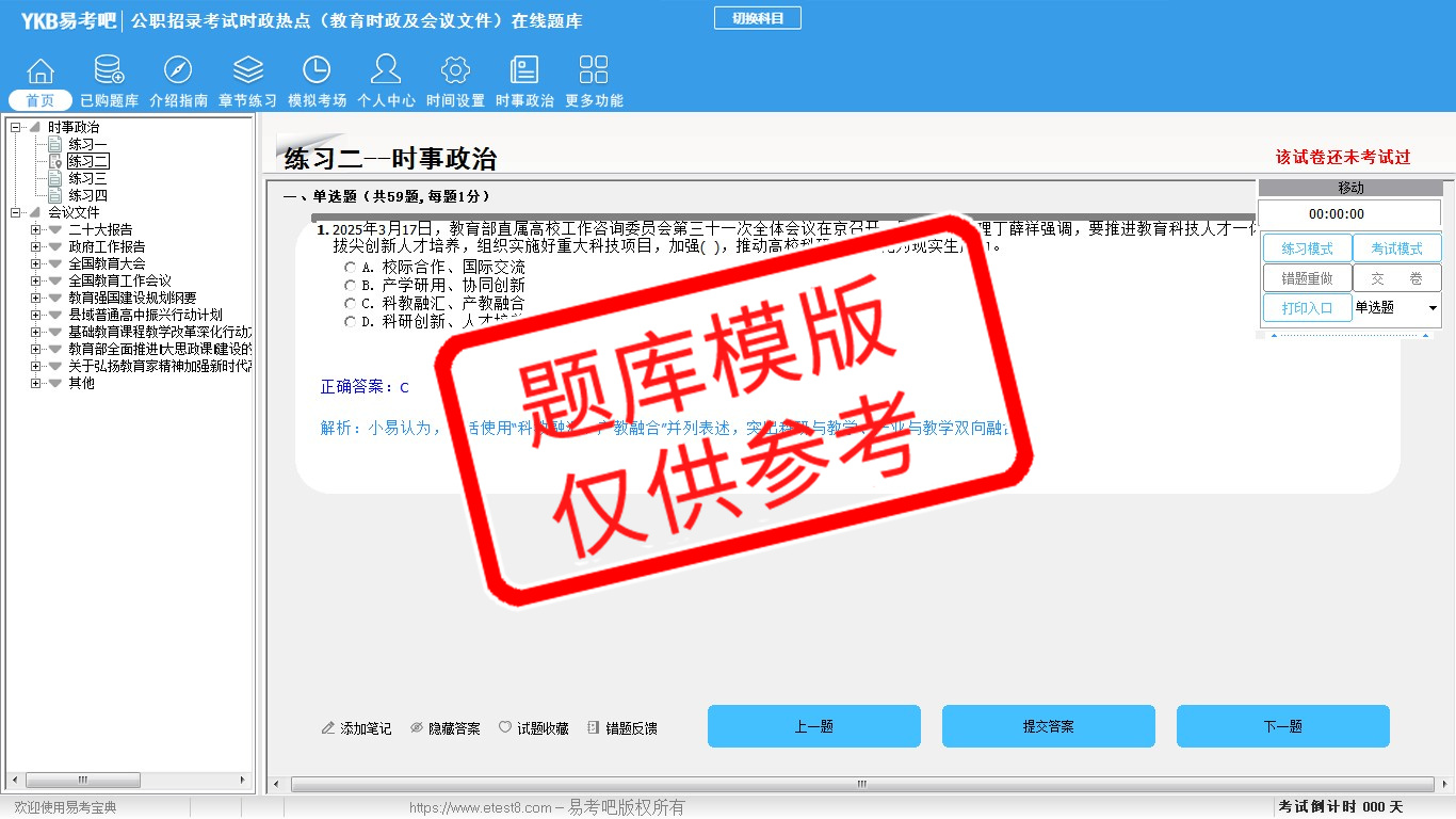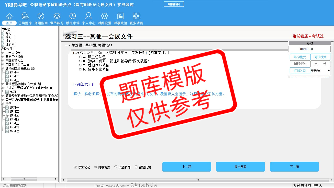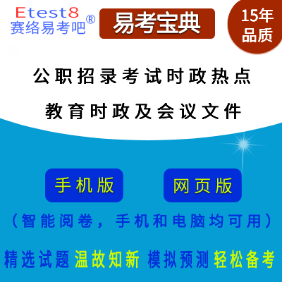 2026年公职招录考试时政热点(教育时政及会议文件)在线题库是易考吧备考复习在线题库之一,是专门为参加“公职招录考试”的朋友量身定做的自我测试系统,是个人、培训学校考前进行提分训练、备考冲刺的训练平台,该题库题型丰富,图文并茂,内容全面;题库设计符合考试新大纲,题库包括了富有价值的模拟考场,有计时打分等功能,就像亲身体会考试一样。题库中的题型和题量详细介绍如下: