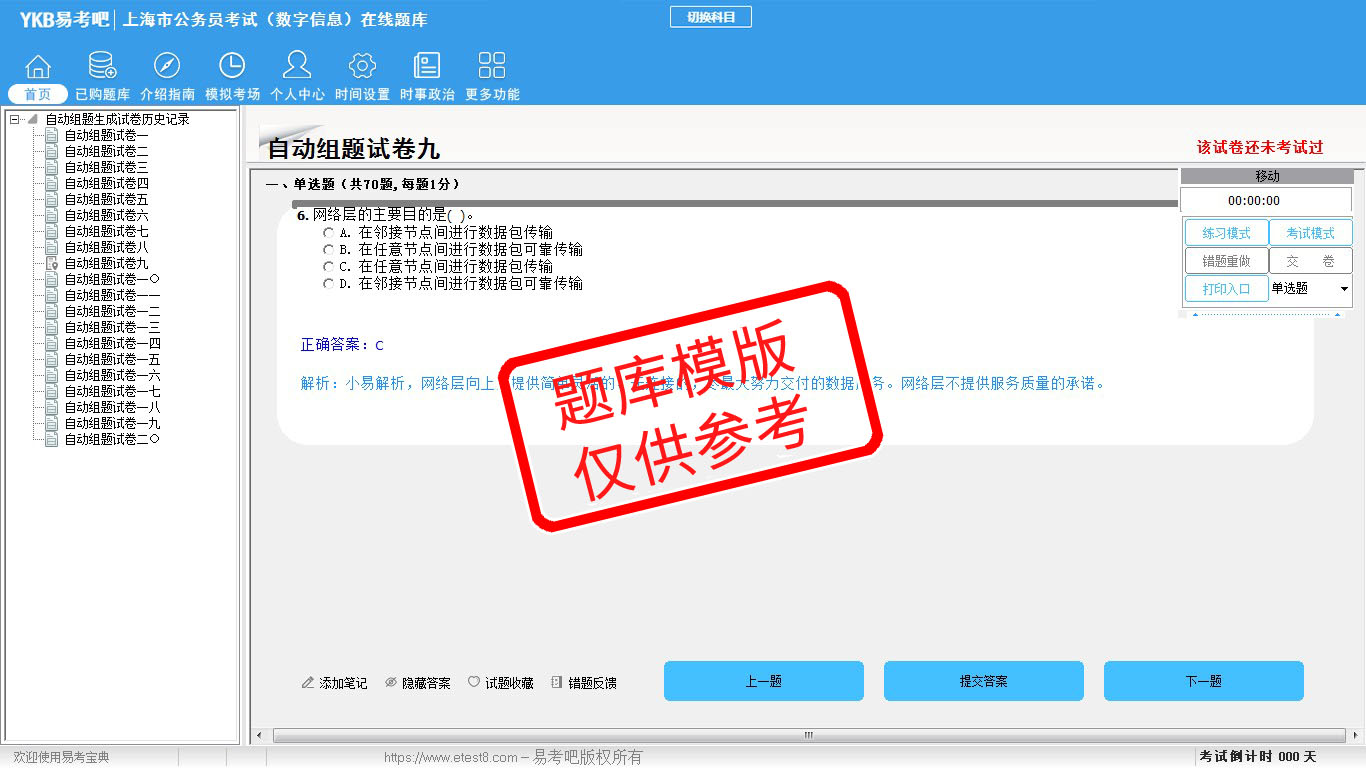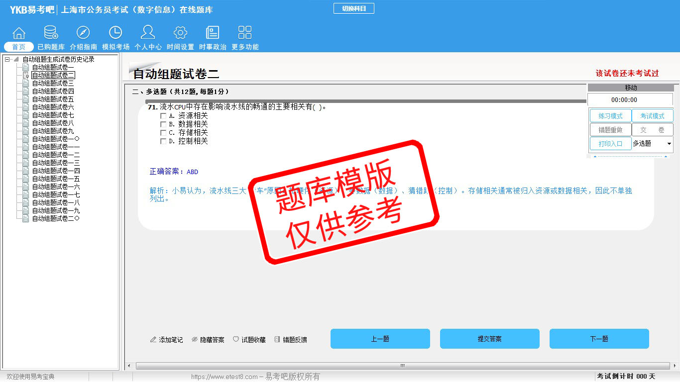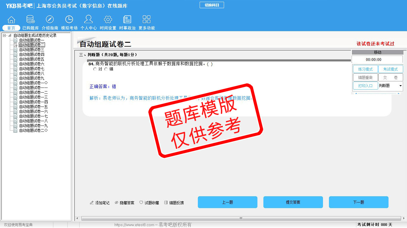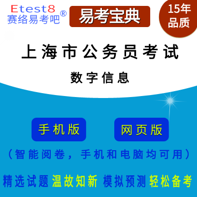 2026年上海市公务员考试(数字信息)在线题库是易考吧备考复习在线题库之一,是专门为参加“上海市公务员考试”的朋友量身定做的自我测试系统,是个人、培训学校考前进行提分训练、备考冲刺的训练平台,该题库题型丰富,图文并茂,内容全面;题库设计符合考试新大纲,题库包括了富有价值的模拟考场,有计时打分等功能,就像亲身体会考试一样。题库中的题型和题量详细介绍如下: