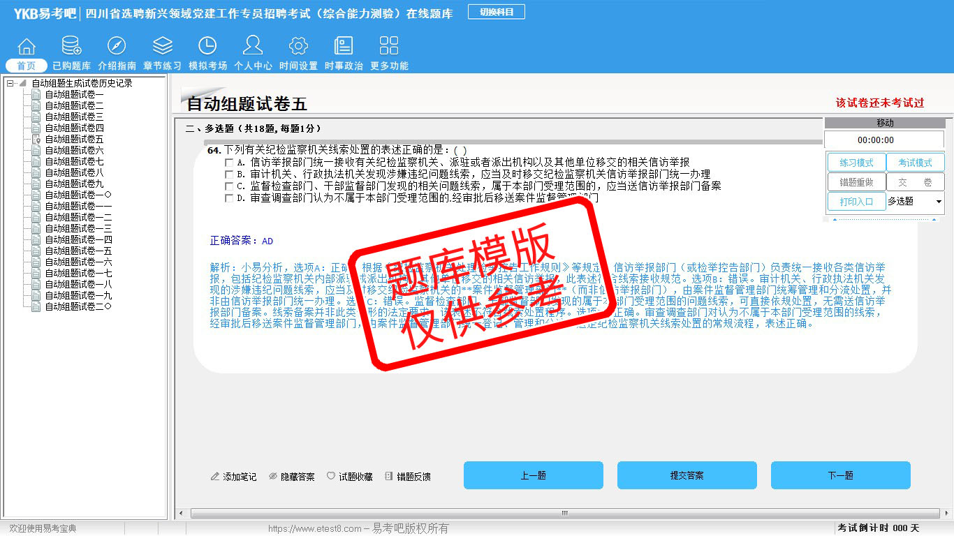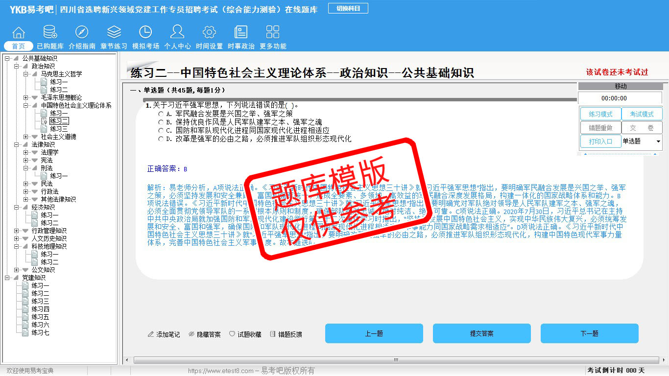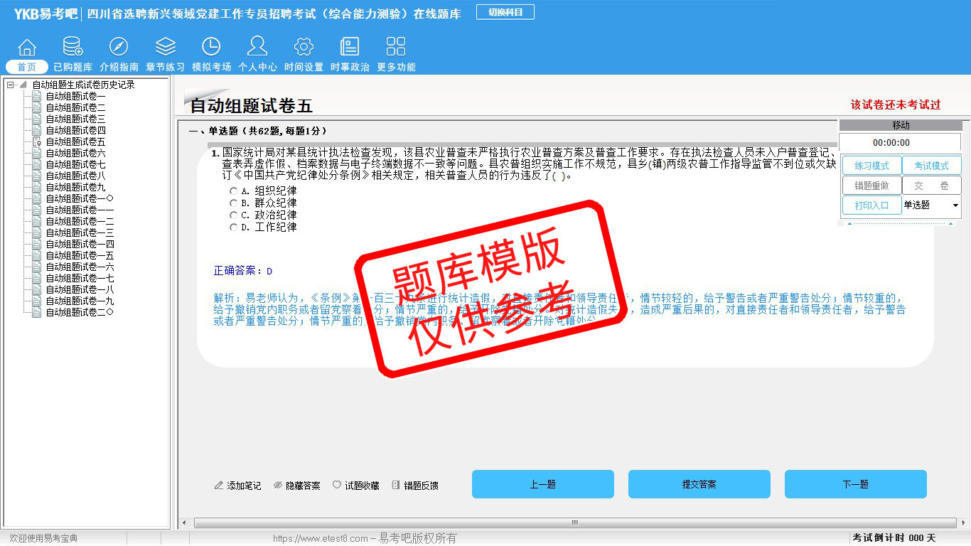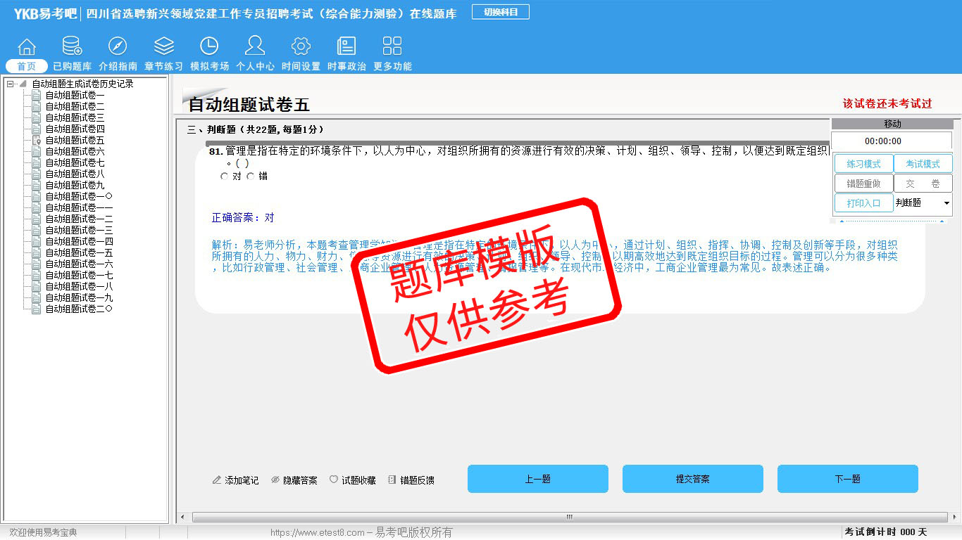 2025年四川省选聘新兴领域党建工作专员招聘考试(综合能力测验)在线题库是易考吧备考复习在线题库之一,是专门为参加“四川省选聘新兴领域党建工作专员招聘考试”的朋友量身定做的自我测试系统,是个人、培训学校考前进行提分训练、备考冲刺的训练平台,该题库题型丰富,图文并茂,内容全面;题库设计符合考试新大纲,题库包括了富有价值的模拟考场,有计时打分等功能,就像亲身体会考试一样。题库中的题型和题量详细介绍如下: