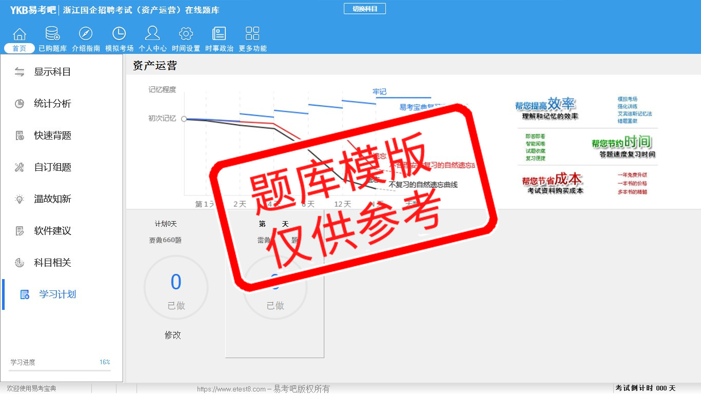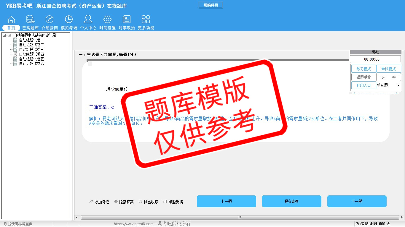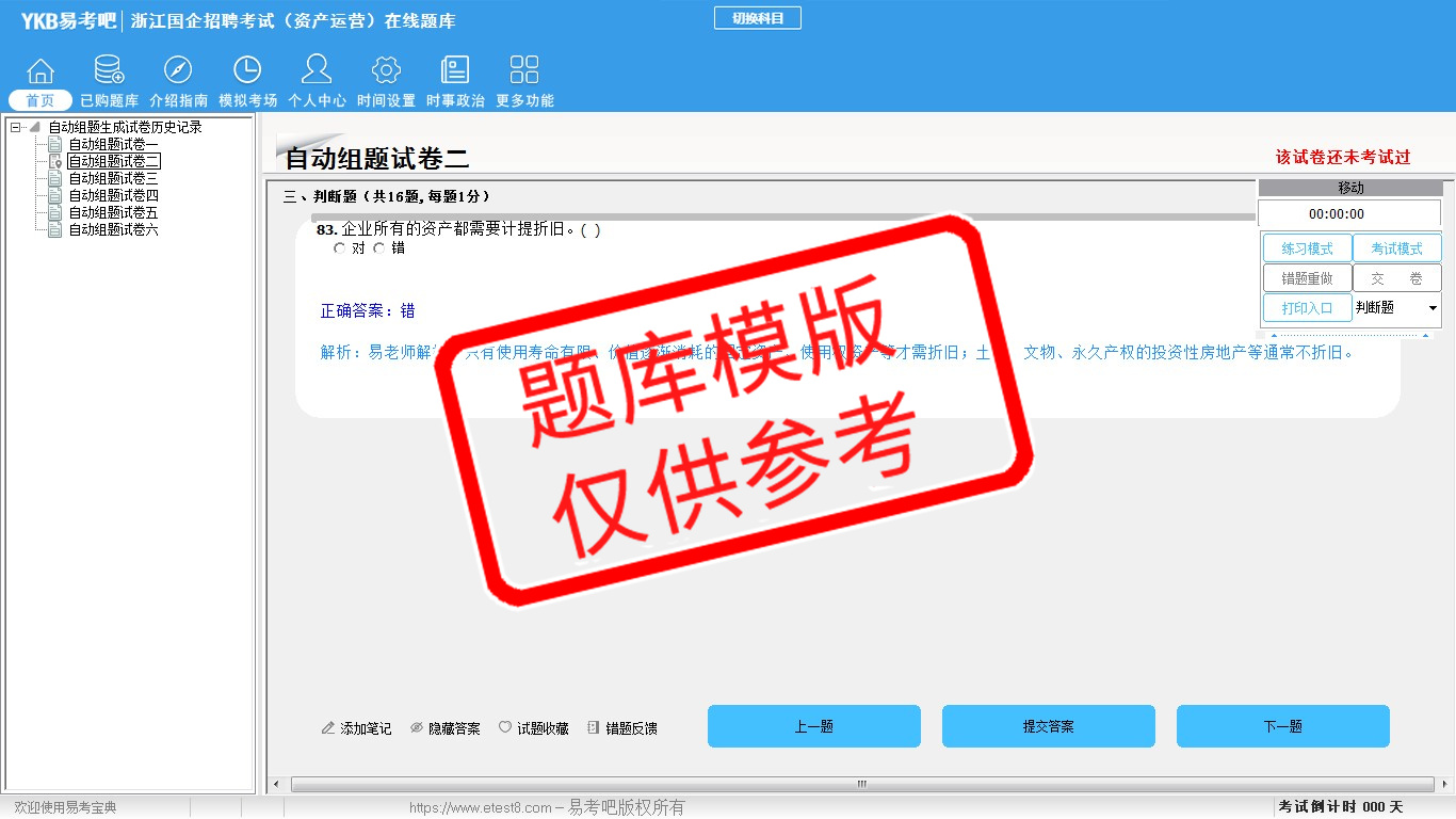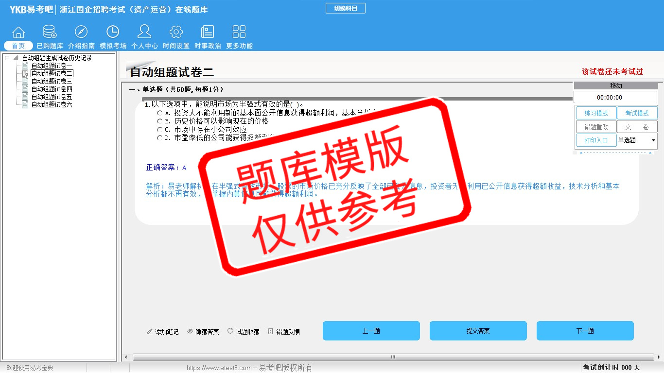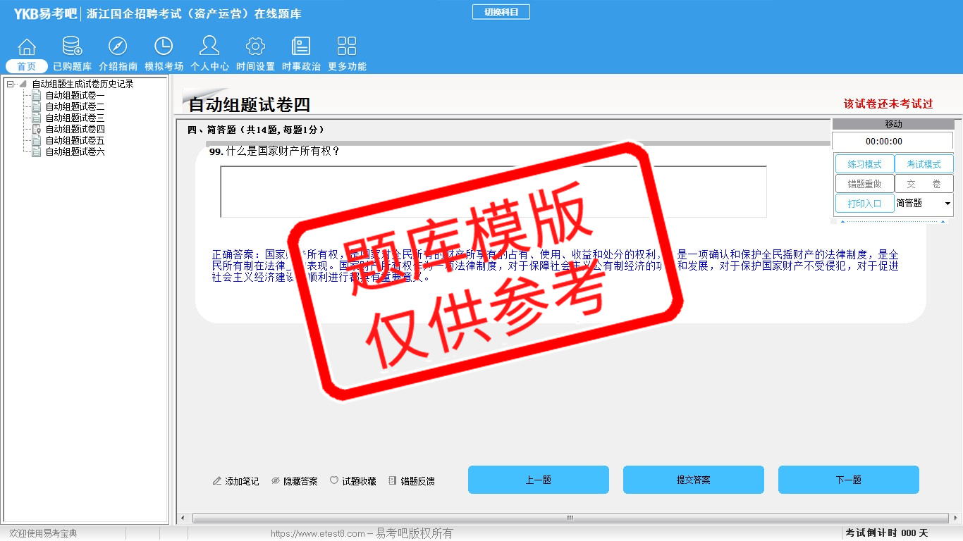 2025年浙江国企招聘考试(资产运营)在线题库是易考吧在线题库系统之一,是专门为参加“国企招聘考试”的朋友量身定做的自我测试系统,是个人、培训学校进行考试前训练、备考冲刺的提分技巧考试平台,题型丰富,图文并茂,内容全面,题库设计符合考试新大纲,海量试题。软件包括了富有价值的模拟考场,有计时打分等功能,就像亲身体会考试一样。软件中的题型和题量详细介绍如下: