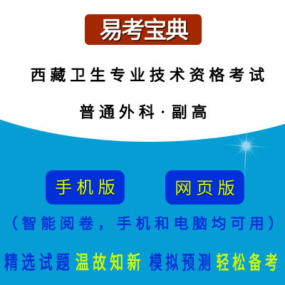 2026年西藏卫生高级职称考试(普通外科·代码011)在线题库(副高)是《易考宝典》考试在线题库之一,是专门为参加“卫生高级职称考试”的朋友量身定做的自我测试系统,是个人、培训学校进行考试前训练、备考冲刺的提分技巧考试平台,题型丰富,图文并茂,内容全面,题库设计符合考试新大纲,海量试题。软件包括了富有价值的模拟考场,有计时打分等功能,就像亲身体会考试一样。软件中的题型和题量详细介绍如下: