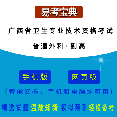 2026年广西卫生高级职称考试(普通外科·代码011)在线题库(副高)是《易考宝典》考试在线题库之一,是专门为参加“卫生高级职称考试”的朋友量身定做的自我测试系统,是个人、培训学校进行考试前训练、备考冲刺的提分技巧考试平台,题型丰富,图文并茂,内容全面,题库设计符合考试新大纲,海量试题。软件包括了富有价值的模拟考场,有计时打分等功能,就像亲身体会考试一样。软件中的题型和题量详细介绍如下: