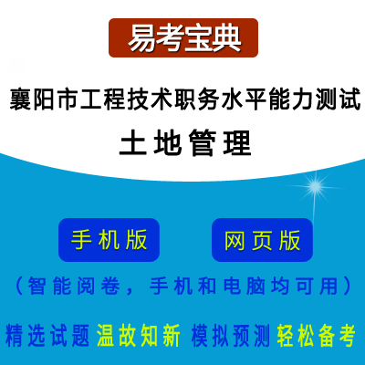 2026年湖北省襄阳市工程技术职务水平能力测试(土地管理)在线题库是易考吧备考复习在线题库之一,是专门为参加“湖北省襄阳市工程技术职务水平能力测试”的朋友量身定做的自我测试系统,是个人、培训学校考前进行提分训练、备考冲刺的训练平台,该题库题型丰富,图文并茂,内容全面;题库设计符合考试新大纲,题库包括了富有价值的模拟考场,有计时打分等功能,就像亲身体会考试一样。题库中的题型和题量详细介绍如下: