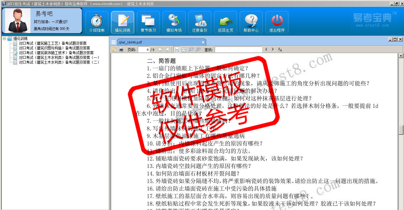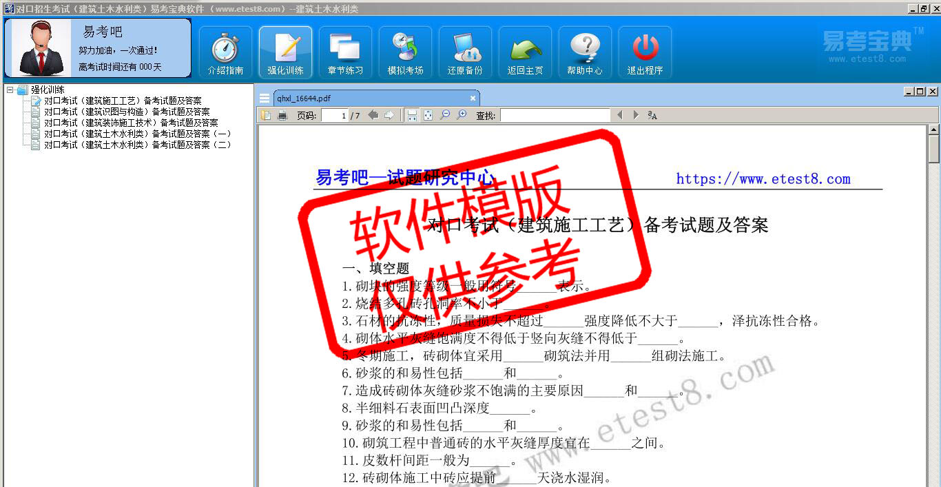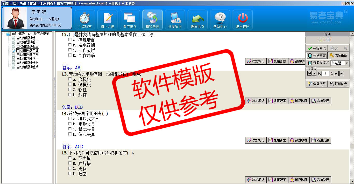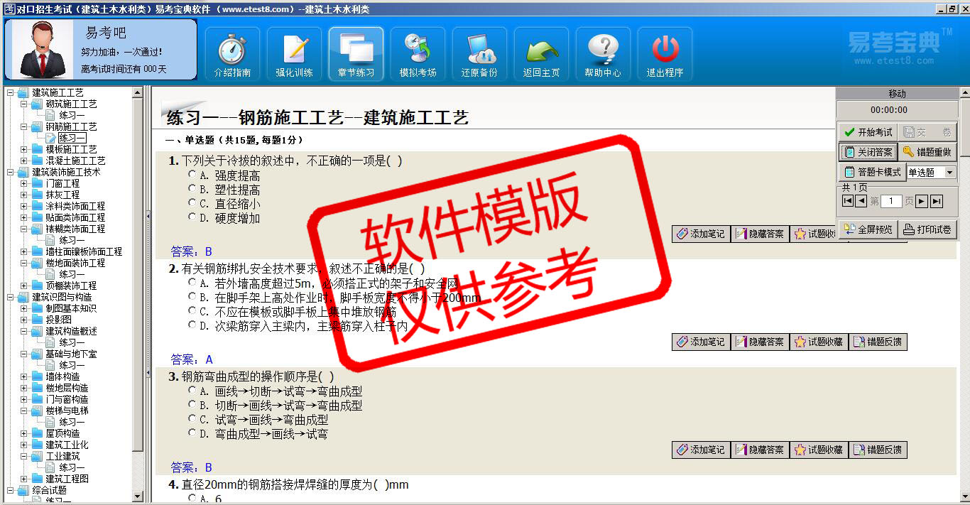 2026年对口招生考试(建筑土木水利类)在线题库是易考吧在线题库考试系列软件之一,是专门为参加对口招生考试的朋友量身定做的自我测试系统,是个人、培训学校进行考试前训练、备考冲刺的提分技巧考试平台,题型丰富,图文并茂,内容全面,题库设计符合考试新大纲,海量试题。软件包括了富有价值的模拟考场,有计时打分等功能,就像亲身体会考试一样。软件中的题型和题量详细介绍如下: