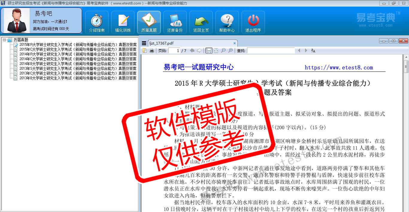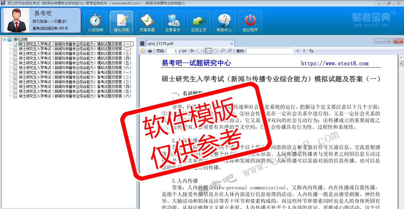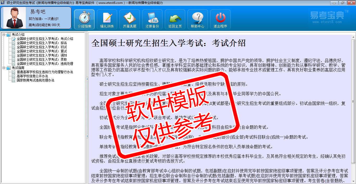 2026年硕士研究生招生考试《新闻与传播专业综合能力》在线题库是易考吧在线题库之一,是专门为参加硕士研究生招生考试的朋友量身定做的自我测试系统,是个人、培训学校进行考试前训练、备考冲刺的提分技巧考试平台,题型丰富,图文并茂,内容全面,题库设计符合考试新大纲,内容丰富,海量试题。软件中的题型和题量详细介绍如下: