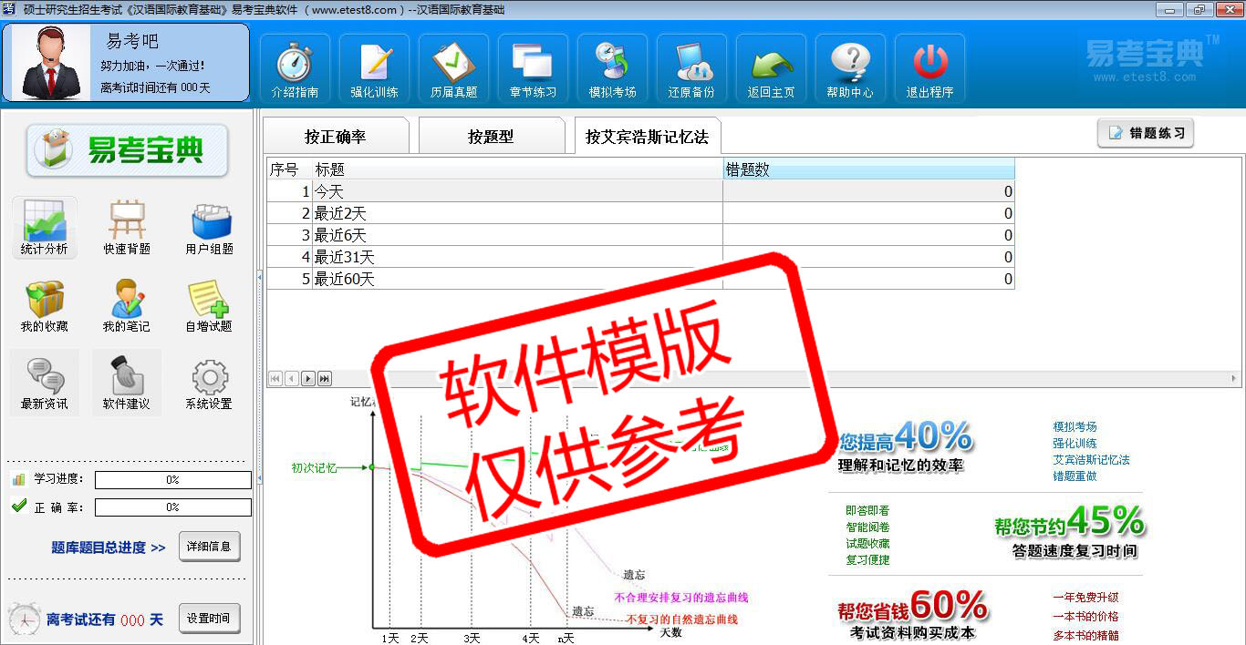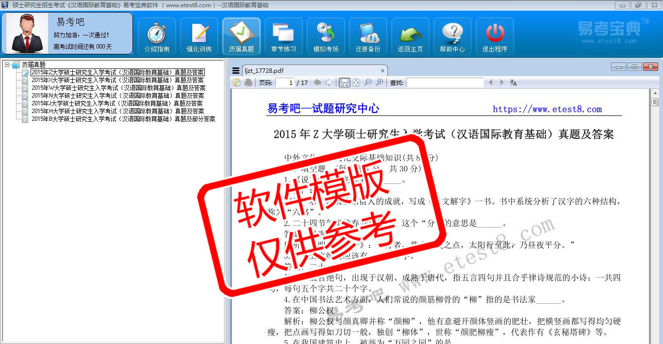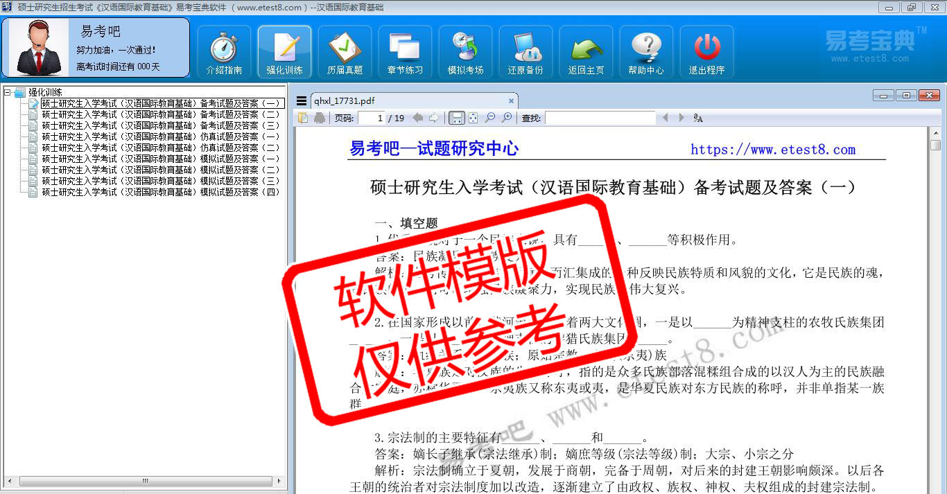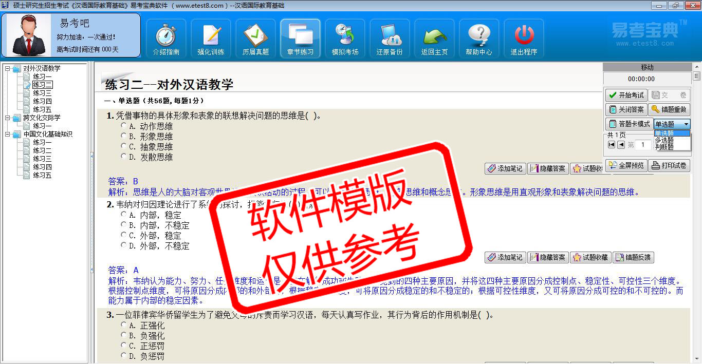 2026年硕士研究生招生考试《汉语国际教育基础》在线题库是易考吧在线题库之一,是专门为参加硕士研究生招生考试的朋友量身定做的自我测试系统,是个人、培训学校进行考试前训练、备考冲刺的提分技巧考试平台,题型丰富,图文并茂,内容全面,题库设计符合考试新大纲,海量试题。软件包括了富有价值的模拟考场,有计时打分等功能,就像亲身体会考试一样。软件中的题型和题量详细介绍如下:
