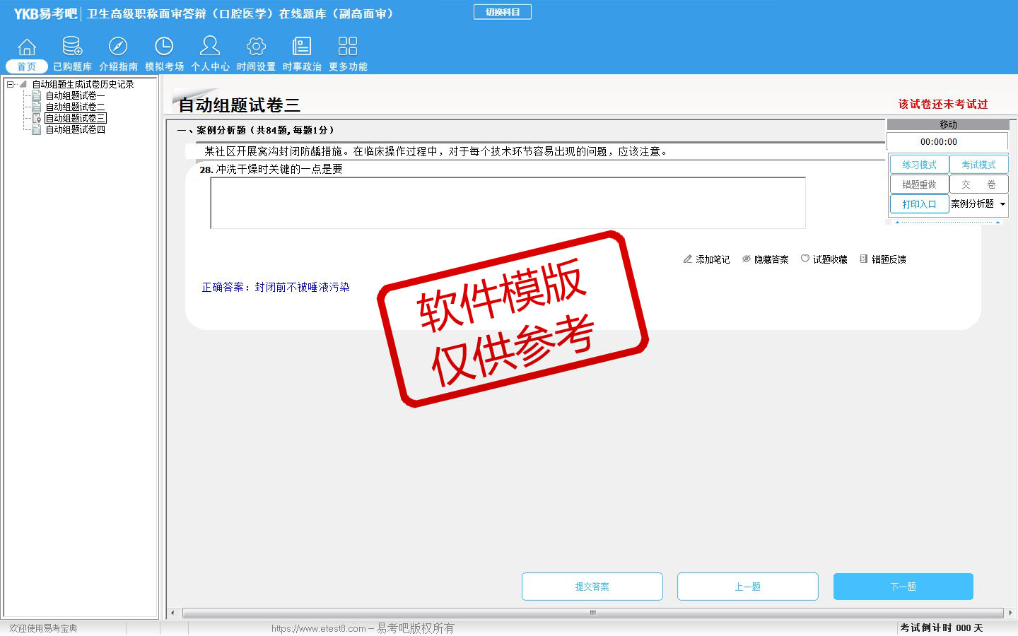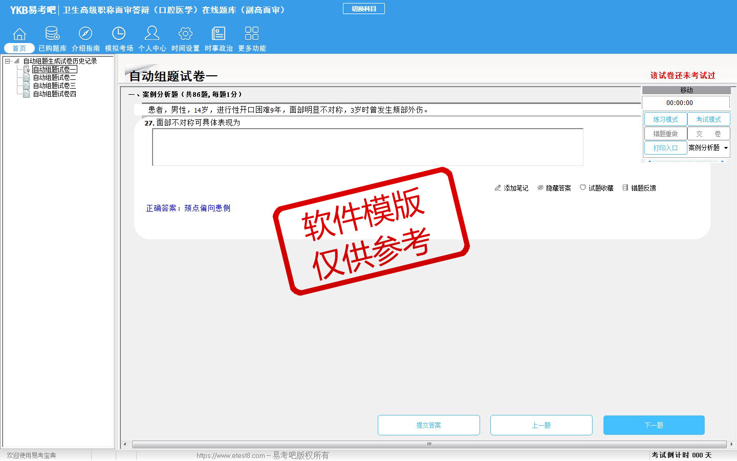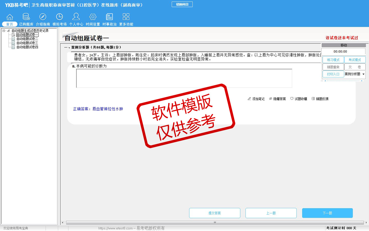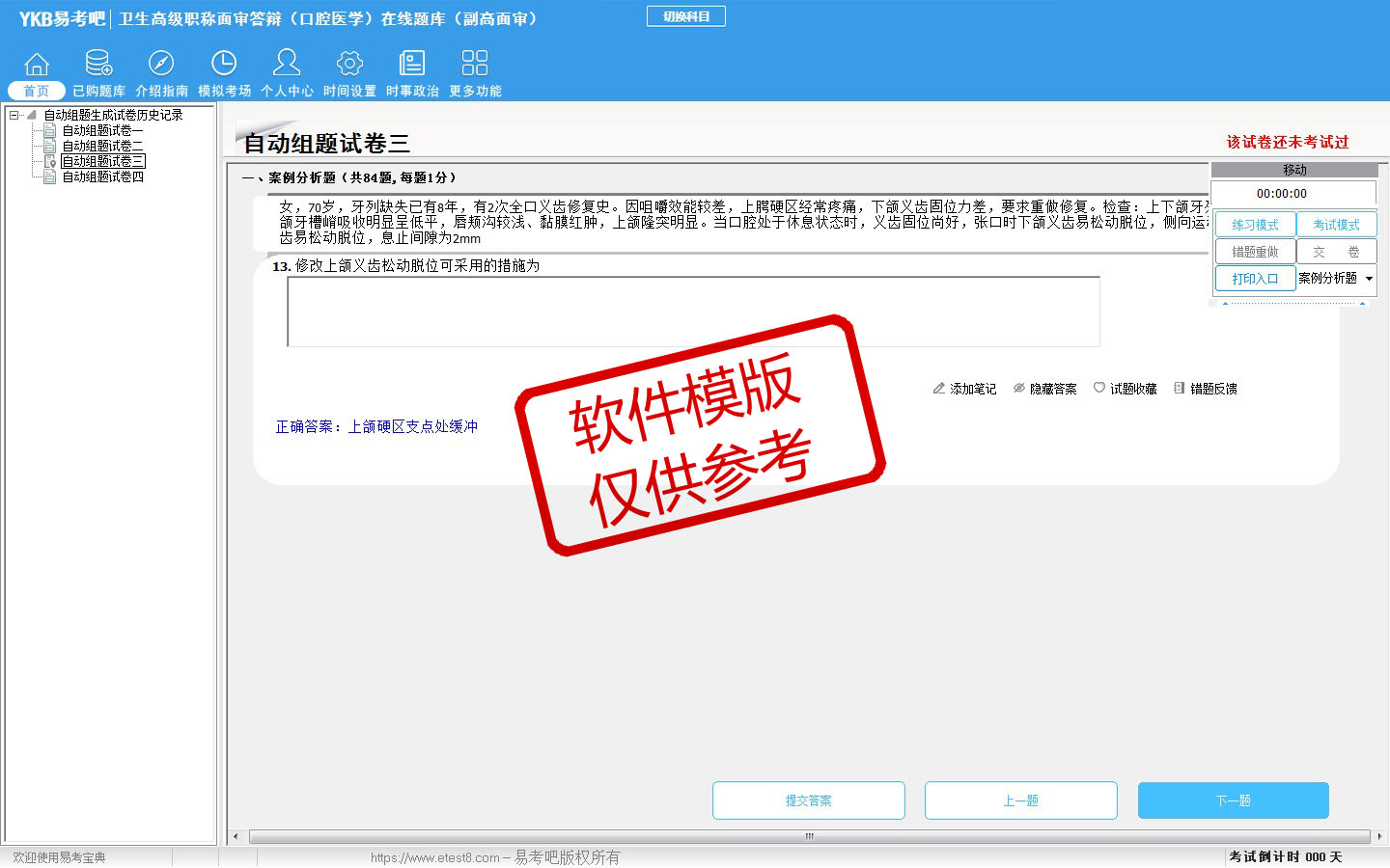 2026年卫生高级职称面审答辩(口腔医学·代码021)在线题库(副高面审)是易考吧备考复习在线题库之一,是专门为参加“卫生高级职称资格考试”的朋友量身定做的自我测试系统,是个人、培训学校考前进行提分训练、备考冲刺的训练平台,该题库题型丰富,图文并茂,内容全面;题库设计符合考试新大纲,题库包括了富有价值的模拟考场,有计时打分等功能,就像亲身体会考试一样。题库中的题型和题量详细介绍如下:
